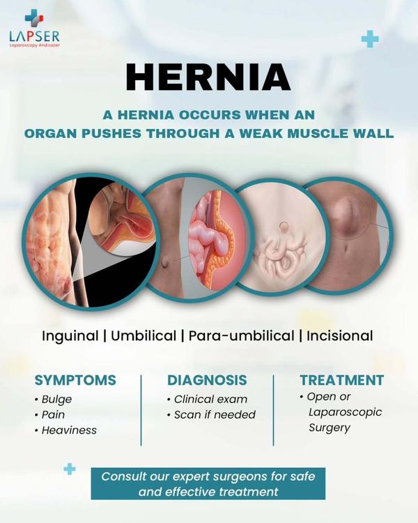 Hernia surgery is the most effective treatment to repair a weakened area of the abdominal wall where internal tissues or organs protrude. We offer advanced laparoscopic and laser-assisted hernia surgery, which are minimally invasive techniques designed to provide safer and more comfortable outcomes.Laparoscopic surgery uses small keyhole incisions and a camera-guided approach to accurately repair the hernia, often with mesh reinforcement for long-term strength. In selected cases, laser-assisted techniques help enhance precision and reduce tissue trauma.Compared to traditional open surgery, these modern methods result in less pain, minimal scarring, reduced risk of complications, shorter hospital stay, and faster recovery, allowing patients to return to their normal routine sooner. Our experienced surgical team ensures personalized care, from diagnosis to post-operative recovery, for the best possible results.